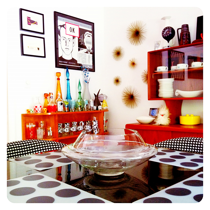 These toucans were also purchased from our pal Barbara when we picked up the Sonneman lamp, and we're happy to have 'em both roosting here in our home. The Avon bottles also came from Kudzu—Valery